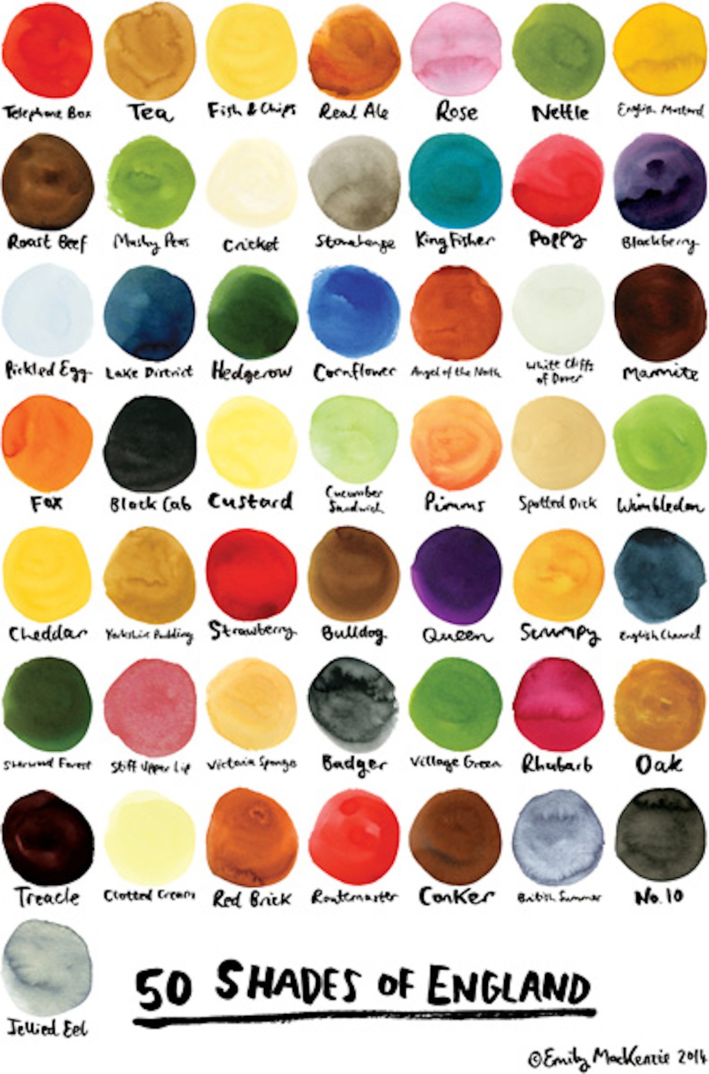 Thankfully this has nothing to do with red rooms. This clever idea is from Scottish illustrator, Emily MacKenzie. There are two prints that you can buy from her Etsy shop; 50 Shades of Scotland and, in the best non-partisan spirit, 50 Shades of England. Interesting to speculate what colours represent a nation; perhaps you’d expect Scotland to be the colours of hills, heather and thistles. Her other illustrations are cute as well. The 50 Shades prints are £25 each.