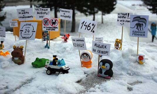 Toys get political 4034 Views January 31, 2012 No Comments Media & web Michelle McWilliams Very short plastic toys have been holding placards to protest over the recent Russian elections. Police in Barnaul, Siberia have asked prosecutors to check if the protest is illegal. Photograph: Sergey Teplyakov/vkontakte Tagged protests in Barnaul SiberiaRussian electionsToys demonstrating